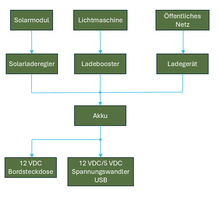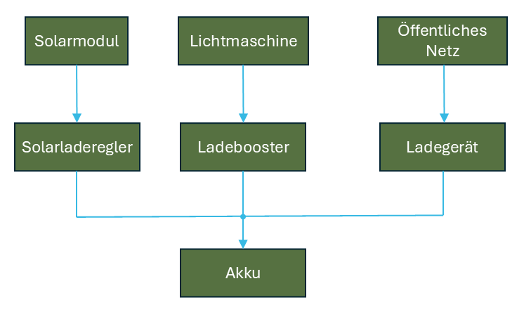 Damit der oder die Energieerzeuger den Akku laden können, wird ein Laderegler benötigt, der auf den verwendeten Akkutyp abgestimmt ist. Soll der Akku auch über Landstrom (also durch Anschluss an ein öffentliches Netz) geladen werden, braucht es zusätzlich einen Laderegler, der die Netzspannung an die Akkuspannung anpasst.
