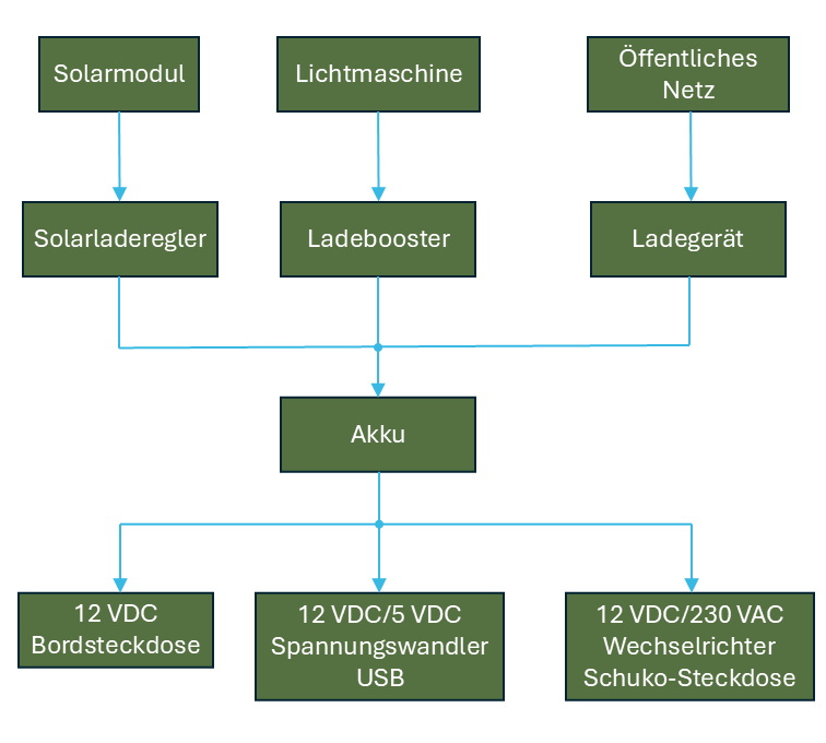 Um sich ohne öffentliches Netz mit Strom zu versorgen, braucht es einen oder am besten mehrere elektrische Energieerzeuger. Für den mobilen Einsatz auf Rädern oder auf dem Wasser sind gängige Energieerzeuger: